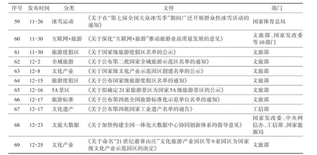 為觀察和研究方便,本文以“文旅融合”“文化旅游”“文旅產(chǎn)業(yè)”等為關(guān)鍵詞,在中國(guó)政府網(wǎng)、文化和旅游部官網(wǎng)、北大法寶等網(wǎng)站進(jìn)行檢索,最終篩選出69項(xiàng)政策文本,深入分析我國(guó)文旅產(chǎn)業(yè)政策的整體性特征、重點(diǎn)場(chǎng)域以及未來(lái)趨勢(shì)。