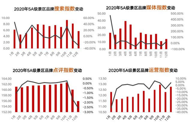 從景區(qū)細分維度走勢來看,5A級景區(qū)年度媒體指數(shù)變動較大,頭部景區(qū)各項指數(shù)全年運行較為平穩(wěn),波動不大。其中故宮博物院、頤和園、拉薩布達拉宮景區(qū)、麗江古城景區(qū)、晉中平遙古城景區(qū)位列5A景區(qū)品牌TOP5。2020年國內4A級景區(qū)媒體指數(shù)變動依然不小,同品牌指數(shù)變化趨勢相同,其他三個指數(shù)則表現(xiàn)相對平穩(wěn),其中壺口瀑布、陜西歷史博物館、中山共有、京杭大運河、西江干戶苗寨位列年度4A級景區(qū)品牌TOP5。