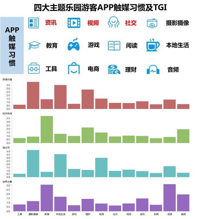 四大游樂(lè)園游客人群表現(xiàn)出一些普遍的APP觸媒偏好,包括資訊類、視頻類、社交類、攝影攝像類,也包括教育類、理財(cái)類等APP,說(shuō)明四大主題公園的游客大多關(guān)注資訊,有一定的生活品質(zhì),也具有一定的投資意識(shí)和投資能力,同時(shí)具有較強(qiáng)的線上消費(fèi)能力。