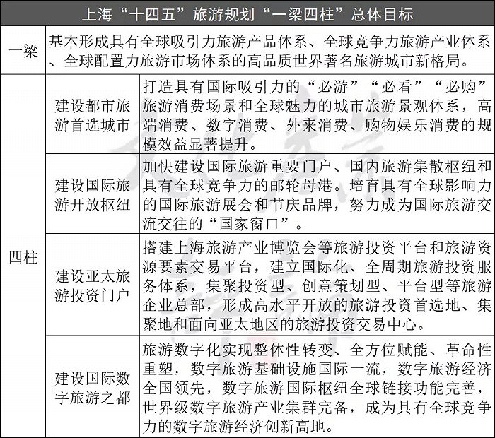 在《上海市“十四五”時期深化世界著名旅游城市建設(shè)規(guī)劃》中將“一梁四柱”寫進總體目標(biāo),即加快形成具有全球吸引力旅游產(chǎn)品體系、全球競爭力旅游產(chǎn)業(yè)體系、全球配置力旅游市場體系的高品質(zhì)世界著名旅游城市新格局,著力將上海建設(shè)成為都市旅游首選城市、國際旅游開放樞紐、亞太旅游投資門戶、國際數(shù)字旅游之都。
