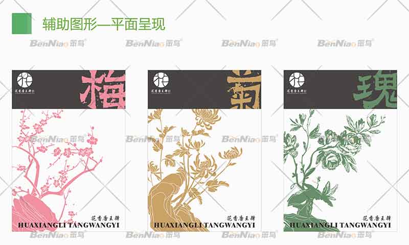 將花圃進行提取設計,分別運用了花圃中的梅花、菊花、玫瑰等元素繪制出三個輔助圖形融入包裝設計中,圖形元素提取的圖像可以直觀的表達商品信息,體現(xiàn)包裝的整體色調(diào),凸顯地區(qū)文化特征,通過包裝設計更直觀地了解當?shù)氐奈幕?/span> 。