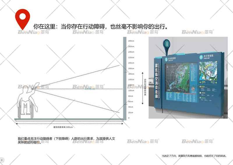 人性化的設(shè)施服務(wù)是一個(gè)城市有序運(yùn)轉(zhuǎn)不可或缺的強(qiáng)大工具。人與城市之間的溝通,最為主要的聯(lián)接載體之一,就體現(xiàn)在城市導(dǎo)視系統(tǒng)上,根據(jù)人群分布和流動(dòng)特點(diǎn)進(jìn)行合理設(shè)置導(dǎo)視牌的尺度與位置,只有這樣才能達(dá)到導(dǎo)視系統(tǒng)與人群行為模式的相配。運(yùn)用充滿關(guān)愛(ài)的通用設(shè)計(jì),提升城市空間的公平性,以靈活的設(shè)置形式,多種類信息傳遞方式方便各類人群的使用。尺度的人機(jī)工程學(xué)考量也將滿足不同不同場(chǎng)景下的使用。