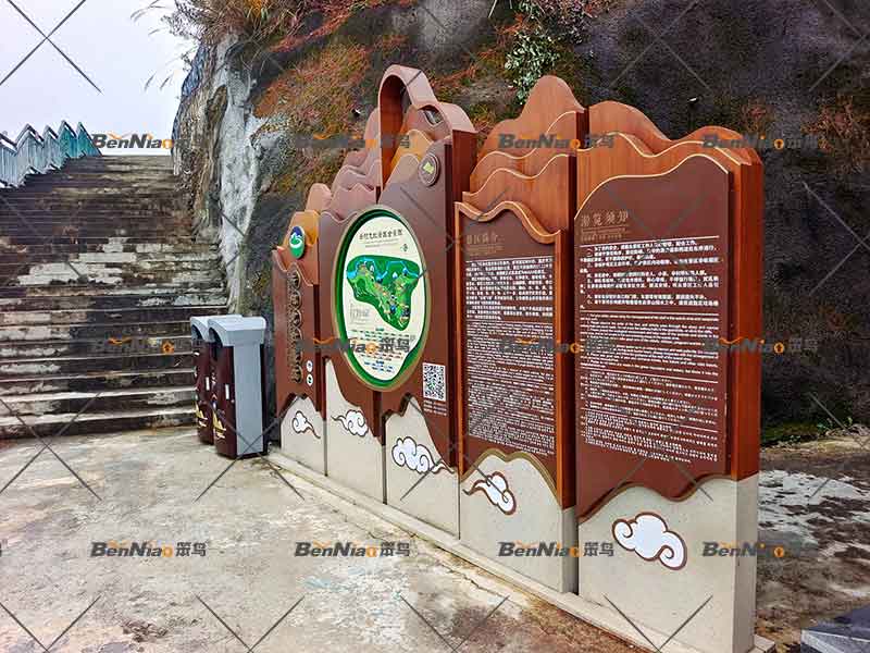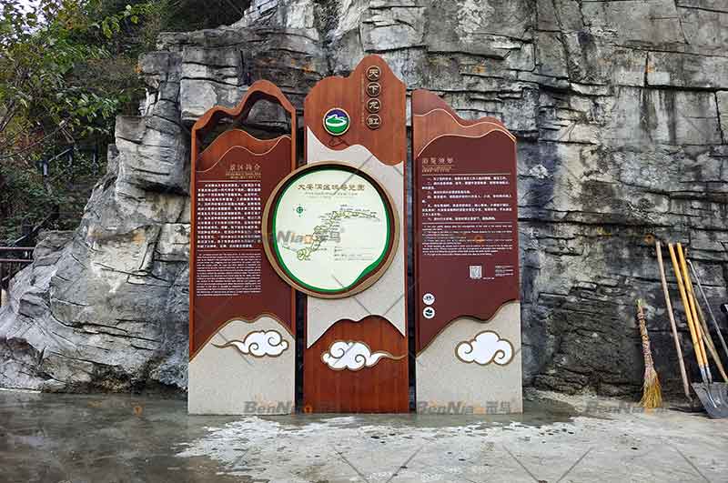 景區(qū)導(dǎo)視牌的材料也是非常講究,既要求牢固性又要體現(xiàn)環(huán)保性,還要考慮安全、耐久在創(chuàng)評分標(biāo)準(zhǔn)里有明確要求。在制作工藝上應(yīng)力求品質(zhì)精準(zhǔn)規(guī)范、堅(jiān)固耐用,文字、圖示不易腐蝕,不易褪色,且便于清洗;避免出現(xiàn)尖角、突出物等易導(dǎo)致游客發(fā)生碰撞的危險(xiǎn)因素。在安裝過程中應(yīng)與空間環(huán)境相協(xié)調(diào),營造一種和諧的氛圍,使之相互襯托,從而達(dá)到既能有利于生態(tài)保護(hù),又能很好地體現(xiàn)景區(qū)標(biāo)識設(shè)計(jì)、制作的特色目的。