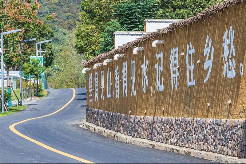 剛一走進這座村落,就被隨處可見的文案和漫山的插畫展所吸引,這是一個因為文案出圈的地方,石塊堆砌的墻、茅草鋪蓋的頂、隨處可見走心的文案標(biāo)語、漫山的插畫展、大草坪、露營基地,有格調(diào)的農(nóng)家樂或咖啡屋等,讓人不由地想起一進村就看得見的那句話“望得見山,看得見水,記得住鄉(xiāng)愁”。