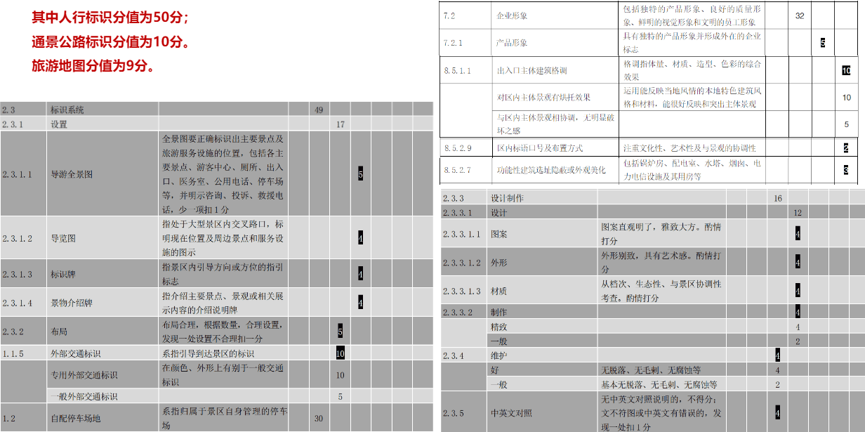 達到850分。其中人行標(biāo)識分值為50分;通景公路標(biāo)識分值為10分。旅游地圖分值為9分。