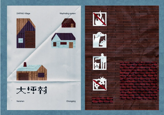 在重慶南岸大坪村的品牌設(shè)計(jì)中,設(shè)計(jì)師在田野調(diào)查時(shí)逐一拍照記錄村民自建房的材質(zhì)、以及具有當(dāng)?shù)靥厣脑刭|(zhì)景觀,從中提取了鄉(xiāng)村界面的“自然原型”,通過(guò)在地材料藝術(shù)再設(shè)計(jì)的方式,讓大坪村自身的肌理用當(dāng)代藝術(shù)設(shè)計(jì)手法重新排列組合、交融,將場(chǎng)地的現(xiàn)在和過(guò)去緊密聯(lián)系在一起,保留下鄉(xiāng)村生活印記。