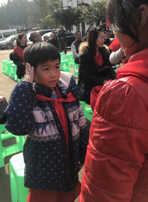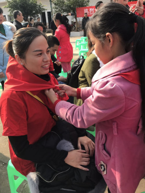 圖為:村小同學(xué)為愛心大使們系上紅領(lǐng)巾