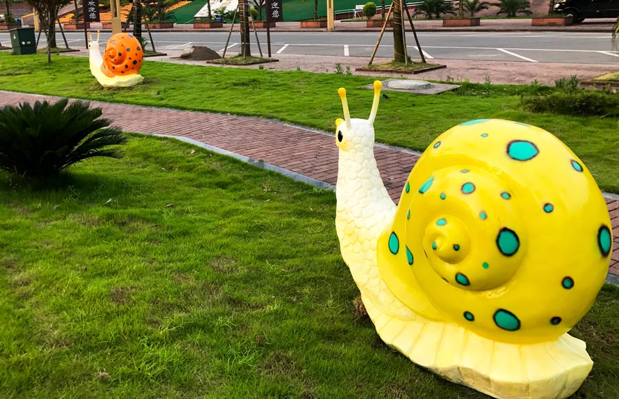 小品以蝸牛造型為載體,蝸牛雖然沒(méi)有矯健的身姿,但其不懈努力、執(zhí)著爬行的精神讓人敬佩,用黃、紫、橙展現(xiàn)出蝸牛的活潑可愛(ài),整個(gè)雕塑充滿歡樂(lè)。立體化地展現(xiàn)了赤水河旅游景區(qū)生命脈絡(luò),充滿正能量。