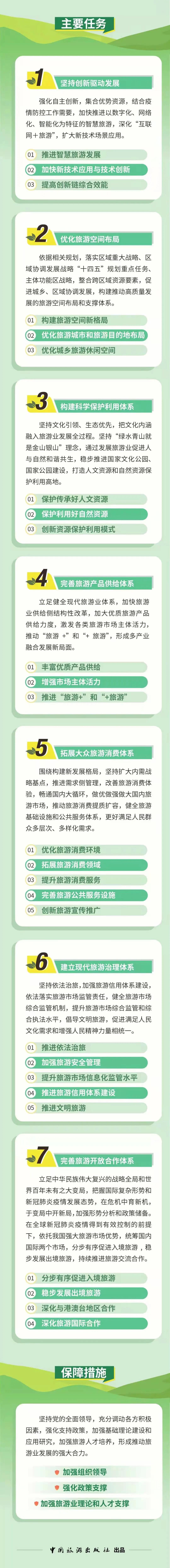 《規(guī)劃》從加強(qiáng)組織領(lǐng)導(dǎo)、強(qiáng)化政策支撐、加強(qiáng)旅游理論和人才支撐等方面保障實(shí)施,要求各地區(qū)結(jié)合本地區(qū)實(shí)際制定旅游業(yè)發(fā)展規(guī)劃或具體實(shí)施方案,明確工作分工,落實(shí)工作責(zé)任。各部門要按照職責(zé)分工,加強(qiáng)協(xié)調(diào)配合,明確具體舉措和工作進(jìn)度,抓緊推進(jìn)。