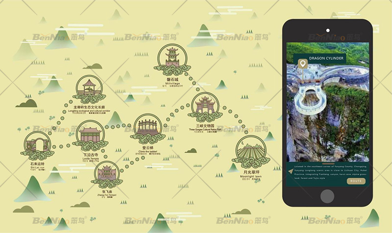 將手繪地圖運(yùn)用在導(dǎo)視系統(tǒng)中,景區(qū)完整呈現(xiàn)在游客面前,讓游客對云陽縣景區(qū)全貌一覽便知,極大的方便了游客對于參觀路線的選擇,了解整座城市的旅游景點(diǎn),人文歷史,為推動云陽縣旅游發(fā)展奠定基礎(chǔ)。