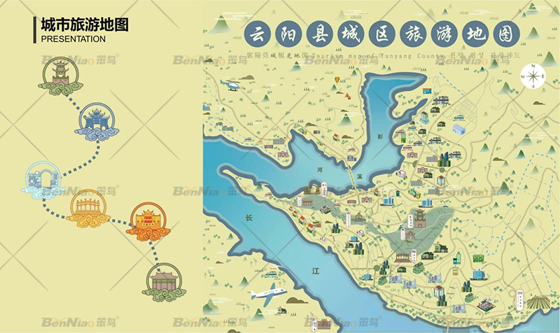 將云陽縣具有特色的標(biāo)志性圖標(biāo)運(yùn)用到手繪地圖中,可通過更具人文內(nèi)涵與親和力的空間表現(xiàn)手法,在立體視角中呈現(xiàn)出特定地點(diǎn)獨(dú)有的文化魅力和個(gè)性色彩。云陽縣手繪地圖不僅僅是標(biāo)注的坐標(biāo),更多的是賦予了云陽縣人性化的靈魂。