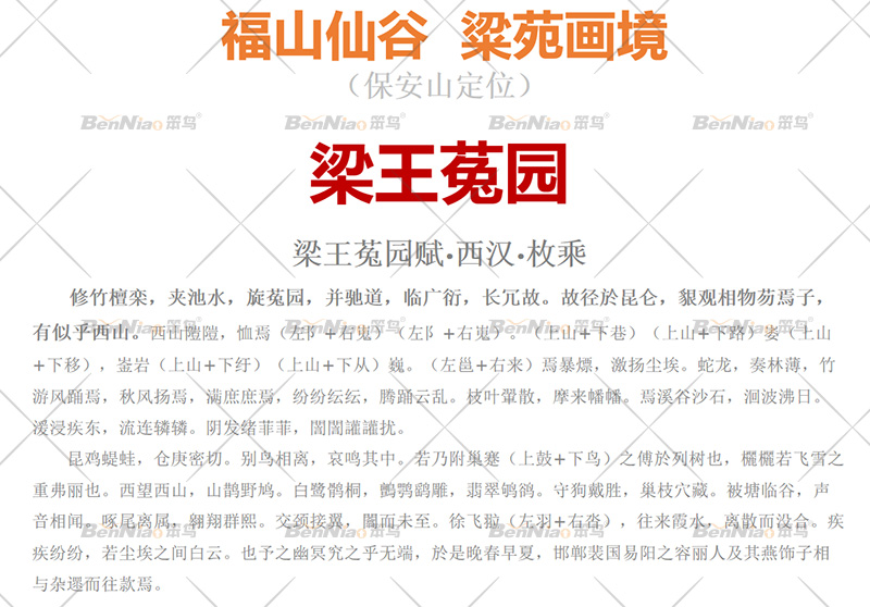 深度挖掘項(xiàng)目人文歷史文化內(nèi)涵,項(xiàng)目以保安山“福山仙谷  粱苑畫境”為主題定位,整體以“梁王菟園”為主題形象進(jìn)行設(shè)計(jì),通過(guò)對(duì)《梁王菟園賦》中所描繪的歷史自然人文畫卷的解讀與再造提升景區(qū)人文氛圍,增強(qiáng)景區(qū)吸引力。