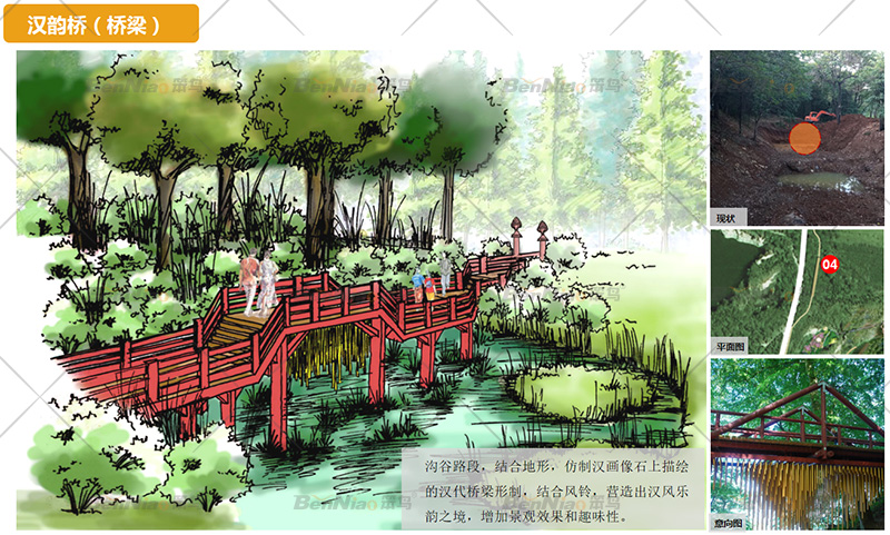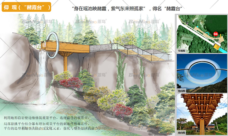 “身在瑤池映赭霞,紫氣東來(lái)照孤家”,得名“赭霞臺(tái)”利用地形沿巖壁邊緣修筑觀景平臺(tái),選擇最佳的觀賞點(diǎn)。局部懸挑平臺(tái)結(jié)合瀑布增加觀景平臺(tái)的刺激性和觀賞性,平臺(tái)的造型和細(xì)節(jié)上結(jié)合漢文化元素,強(qiáng)化與整個(gè)景區(qū)的融合。利用當(dāng)?shù)爻鐾恋奈奈镉耔?,結(jié)合現(xiàn)代的材料,打造網(wǎng)紅節(jié)點(diǎn)。