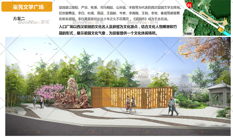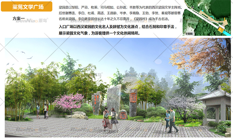 入口廣場(chǎng)以西漢梁園的文化名人及辭賦為文化源點(diǎn),結(jié)合石刻和印章手法,展示梁園文化氣象,為游客提供一個(gè)文化休閑場(chǎng)所。