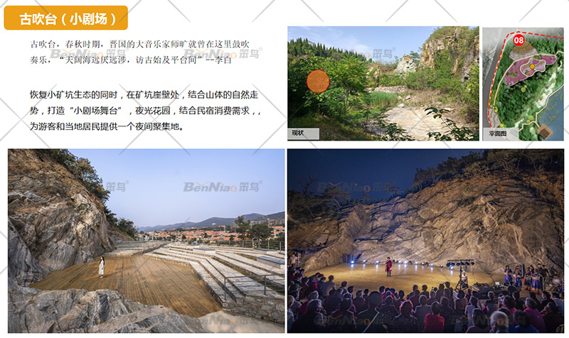同時(shí)在礦坑崖壁處,結(jié)合山體的自然走勢(shì),打造“小劇場(chǎng)舞臺(tái)”,夜光花園結(jié)合民宿消費(fèi)需求,為游客和當(dāng)?shù)鼐用裉峁┮粋€(gè)夜間聚集地。