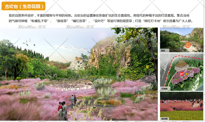 豐富的植物與平坦的地勢(shì),古吹臺(tái)的設(shè)置意在恢復(fù)礦坑的生態(tài)景觀性。用現(xiàn)代的種植手法打造景觀,集合當(dāng)?shù)氐臍夂蚩煞N植“粉黛亂子草”、“狼尾草”、“橘紅苔草”、“花葉芒”等易打理的觀賞草,打造“網(wǎng)紅打卡地”吸引流量與廣大人群。