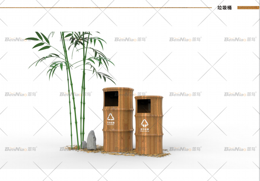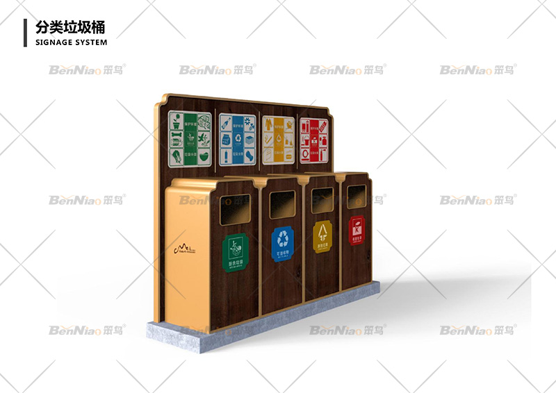 垃圾桶的設(shè)計應(yīng)體現(xiàn)環(huán)保理念,設(shè)置分類回收垃圾桶,在材料選擇上內(nèi)桶可以選擇塑料、金屬,方便實用,外桶則應(yīng)根據(jù)景區(qū)主題選擇木材、石材、不銹鋼、竹子等材料。