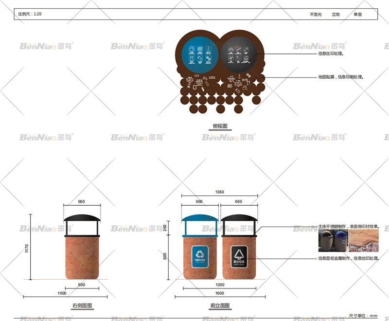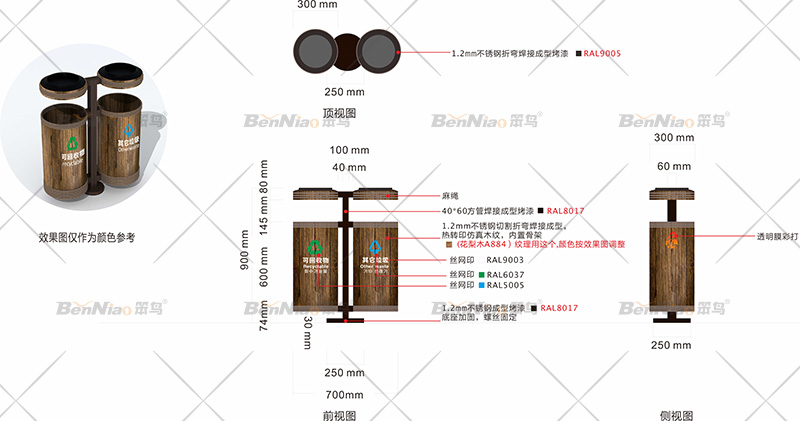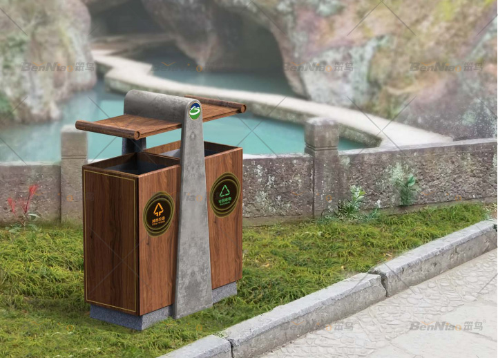 此垃圾桶的設(shè)計根據(jù)景區(qū)特色提取要素,在桶身設(shè)計上左右倆側(cè)設(shè)計可回收與其他垃圾的收納箱。材質(zhì)選用木材鋼板,整體結(jié)構(gòu)合理,滿足各種功能需求,又突出主題,造型既實用又很簡潔大氣。
