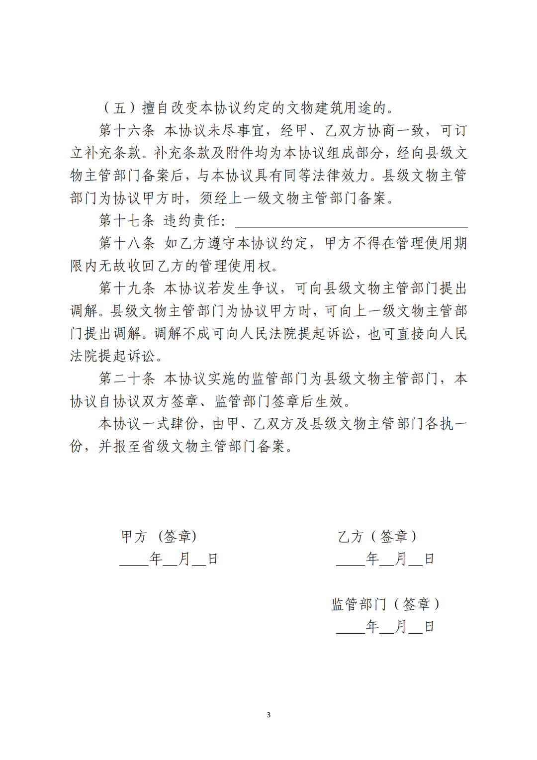 省級(jí)文物主管部門可參照社會(huì)力量參與文物建筑保護(hù)利用協(xié)議參考文本(附后),結(jié)合本地實(shí)際,制定社會(huì)力量參與文物建筑保護(hù)利用協(xié)議文本。按照“一處一策”原則,文物建筑所有人或使用人與確定的社會(huì)力量主體簽訂保護(hù)利用協(xié)議,明確保護(hù)利用要求、各方權(quán)利義務(wù)和違約責(zé)任等內(nèi)容。沒有明確使用人的國有文物建筑可由縣級(jí)文物主管部門與社會(huì)力量主體簽訂保護(hù)利用協(xié)議。協(xié)議簽訂后,應(yīng)報(bào)至省級(jí)文物主管部門備案。