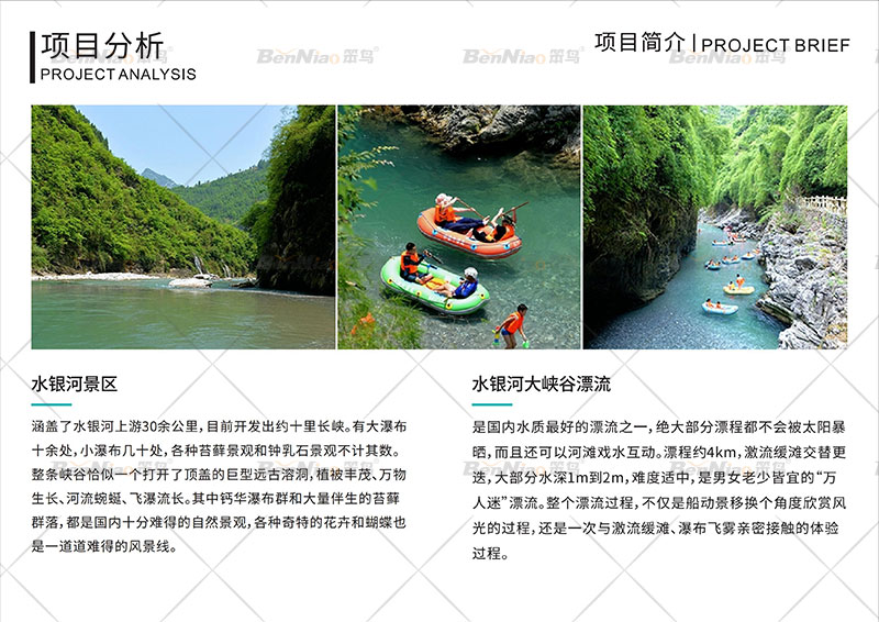 水銀河大峽谷漂流 :國內(nèi)水質(zhì)最好的漂流之一,絕大部分漂程都不會被太陽暴曬,而且還可以河灘戲水互動。漂程約4km,激流緩灘交替更迭,大部分水深1m到2m,難度適中,是男女老少皆宜的“萬人迷”漂流。整個漂流過程,不僅是船動景移換個角度欣賞風光的過程,還是一次與激流緩灘、瀑布飛霧親密接觸的體驗過程。