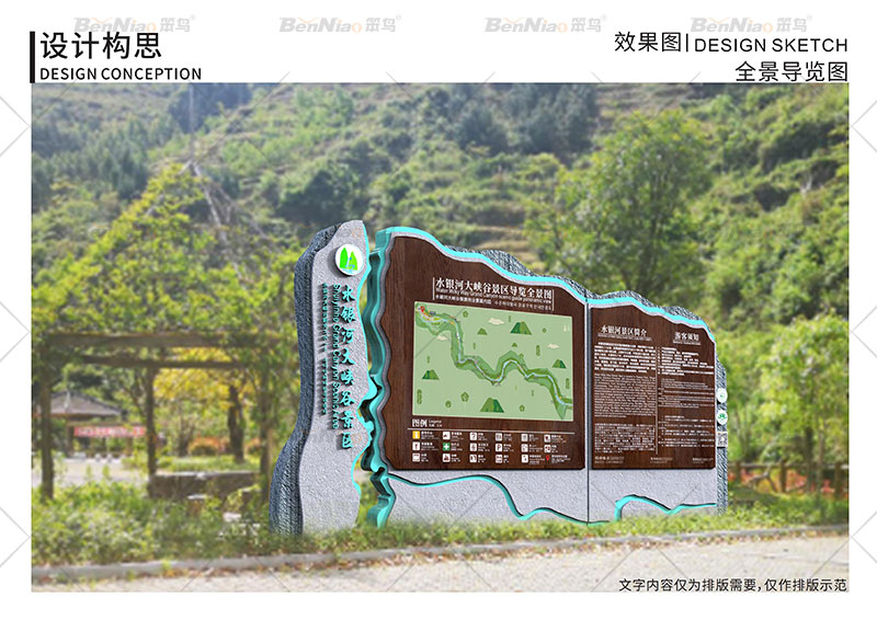 三、說明導(dǎo)視系統(tǒng):在旅游景區(qū)中說明性導(dǎo)視系統(tǒng)必不可少。它表達了希望被游客了解的內(nèi)容,讓游客對當?shù)氐木皡^(qū)特色、歷史、旅游景點等有一定的了解。讓游客在旅行的過程中擁有更好的體驗。同時也方便管理者進行管理。笨鳥文旅為水銀河大峽谷景區(qū)規(guī)劃設(shè)計的景區(qū)介紹標識牌。