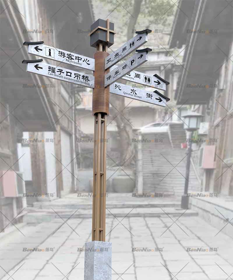 隨著文旅特色小鎮(zhèn)的加速發(fā)展建設(shè),導(dǎo)視系統(tǒng)已經(jīng)成為特色小鎮(zhèn)一項(xiàng)重要的基礎(chǔ)公共設(shè)施,不僅可以為人們提供環(huán)境信息、指示導(dǎo)引的基本功能,還能有效的為當(dāng)?shù)鼐用癯鲂袔肀憷?,為外來游客帶來很大程度的友好感,還可以起到環(huán)境優(yōu)化和輔助管理等功能。