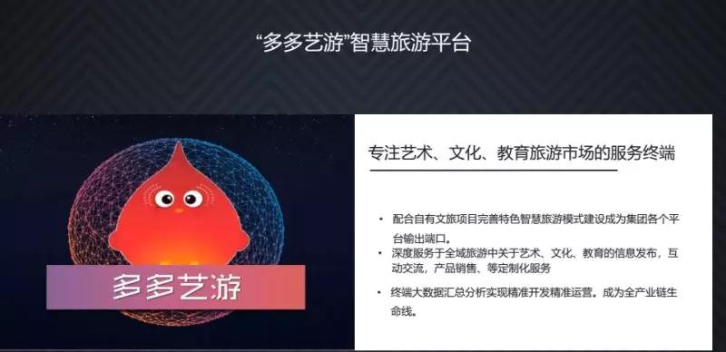 最后還提到了多多藝游智慧旅游平臺,是一種專注藝術(shù)、文化、教育旅游市場的服務(wù)終端,深度服務(wù)于全球旅游中關(guān)于藝術(shù)、文化、教育的信息發(fā)布,具備互動(dòng)交流,產(chǎn)品銷售,定制化服務(wù)等功能,能夠?qū)崿F(xiàn)終端大數(shù)據(jù)匯總分析實(shí)現(xiàn)精準(zhǔn)開發(fā)精準(zhǔn)運(yùn)營的旅游平臺。