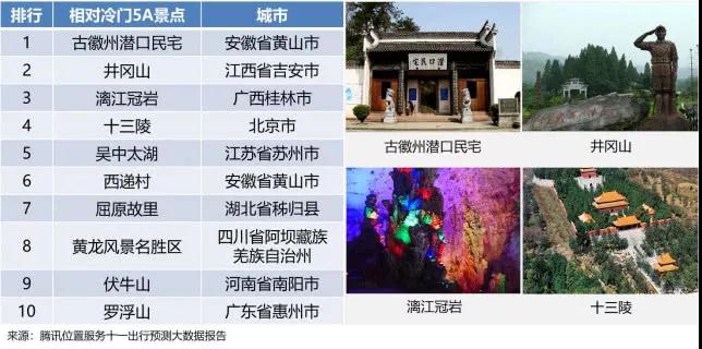 不過,不管是南方還是北方,不管是歷史古跡還是古城古鎮(zhèn)、山岳湖泊,到了國慶黃金周,景區(qū)必然是人擠人、人挨人,讓很多游客抱怨“風(fēng)景沒看多少,只看到數(shù)不清的人頭和屁股”,想找風(fēng)景優(yōu)美但游客不那么多的景點嗎?騰訊位置服務(wù)發(fā)布的國慶旅游大數(shù)據(jù)報告顯示,在國家旅游局確定的249個國家5A級旅游風(fēng)景區(qū)中,古徽州潛口民宅、井岡山、漓江冠巖、北京十三陵、蘇州吳中太湖、黃山西遞村屈原故里、四川黃龍風(fēng)景名勝區(qū)、南陽伏牛山、惠州羅浮山是相對冷門的十大5A風(fēng)景區(qū)。十一出游不想看“人”,不妨試試這些相對冷門的景點吧!